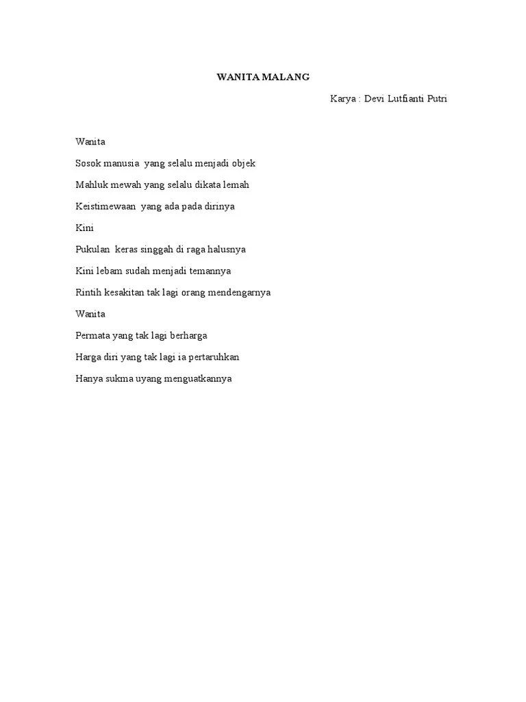 Puisi tentang wanita malam 6 bait 22 baris oleh ahmad baihaki malam mulai menyapa terdengar tapak kaki perlahan sembari membawa sehelai kain . Kami memberikan sebuah racikan puisi dari kami, kepada para pembaca. Berikut adalah contoh puisi berantai tiga orang yang bisa anda . Wanita tangguh pembuat kopi yang setia. Meletakan cangkir dari isi hatinya.